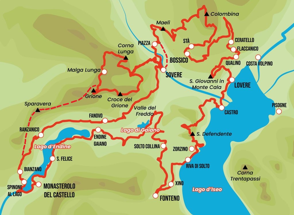 Un percorso che unisce le valli in provincia di Bergamo al confine con la provincia di Brescia, passando da un lago all’altro: il lago d’Endine, il piccolo laghetto di Gaiano e il principale, il lago d’Iseo nel cui bacino svetta Monteisola, l’isola lacustre più grande d’Europa. Il percorso scavalca crinali boscosi per portarci da una vista all’altra, e una intera giornata la dedicheremo all’esplorazione di Monteisola. Non mancheranno aneddoti locali, e incontri con la ricca cucina valligiana. Il cammino è dotato di credenziale.