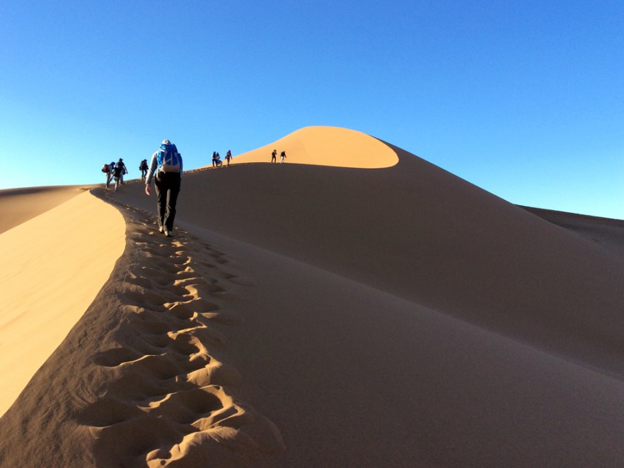 Da Foum-Zguid (il colle di Zguid) a M’hamid El Ghizlane (piana delle gazzelle). Un viaggio a piedi nel Sahara alla ricerca delle suggestioni più intimamente legate al nostro immaginario del deserto: il mare di sabbia, l’orizzonte senza confini, le albe e i tramonti fra i dolci profili delle dune, l’immensa volta stellata e l’assoluto silenzio.