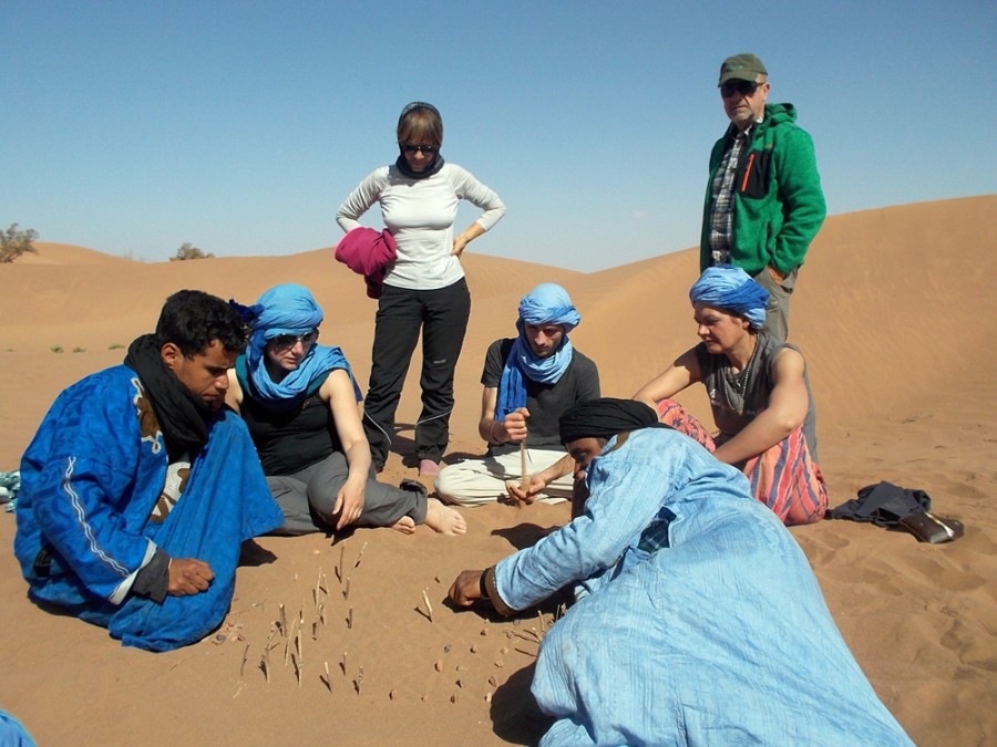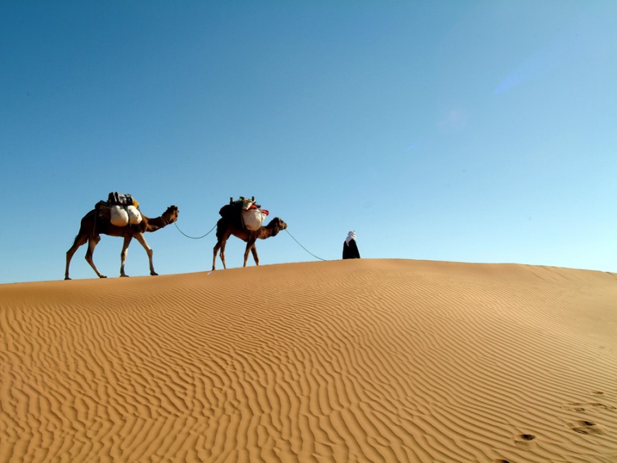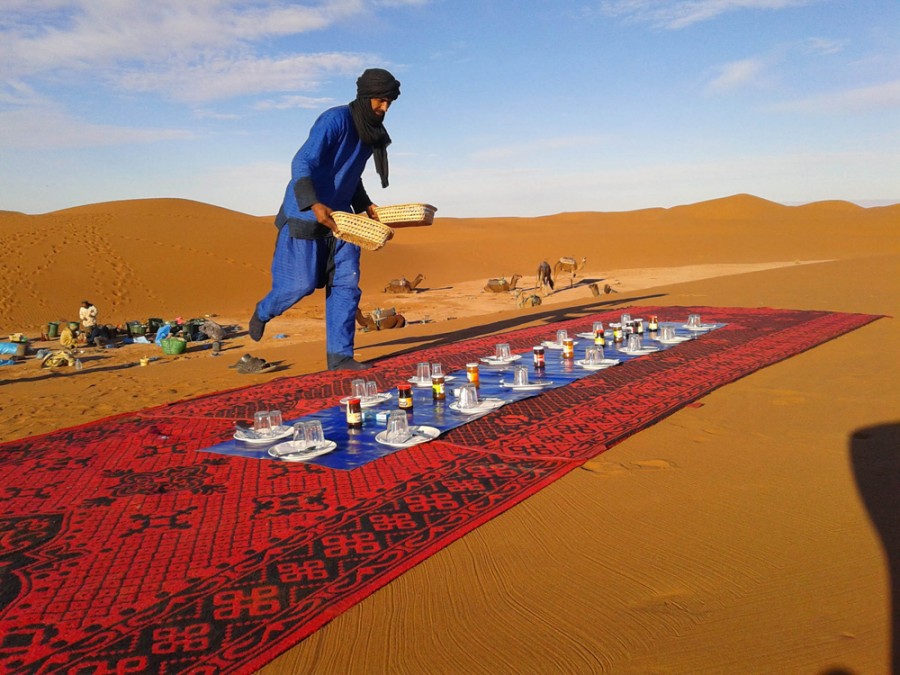 Entreremo in contatto con la cultura nomade Berbera e Saharawi e col culto dei Marabutti. Visiteremo l’antico villaggio fortificato, o kzar, di M’hamid El Ghizlane, detto anche Porta del Deserto perché si tratta dell’ultimo centro abitato della Valle della Dràa. Qui infatti la strada si interrompe e anche il fiume scompare, inghiottito dall’arida terra, dando inizio alla grande Hammade. Una significativa testimonianza della civiltà sahariana, la cui piazza è stata per secoli, e fino a un passato recente, il punto di arrivo e di partenza delle mitiche carovane provenienti o dirette a Timbouctou, nel Mali: cinquanta giorni di marcia a passo di dromedario.