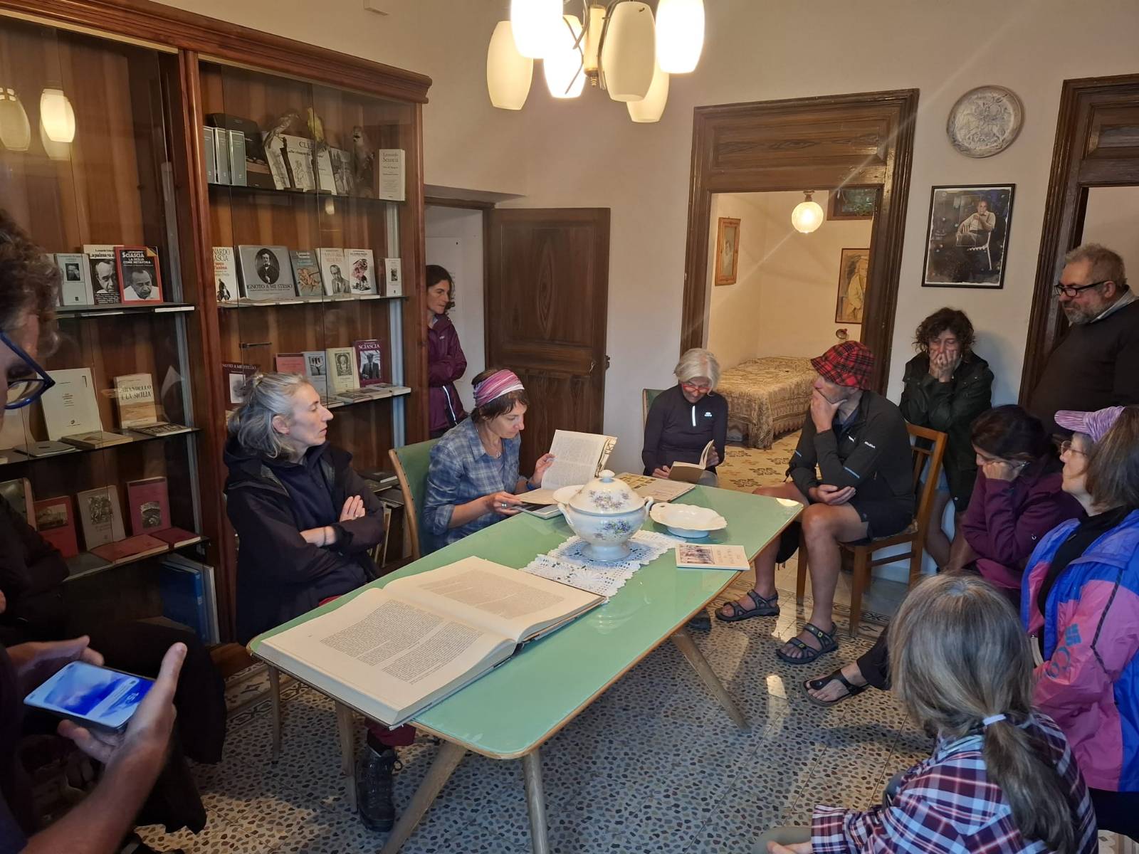 Ma il luogo forse più affascinante di tutti è Casa Sciascia (nella foto un gruppo della Compagnia legge alcune pagine dello scrittore nel salone dell’abitazione), cuore pulsante di questo viaggio letterario. Qui Sciascia iniziò a leggere e a scrivere, in uno studio minuscolo che si affaccia sul paese attraverso una piccola finestra. Oggi la dimora è diventata una casa museo che conserva i mobili originali e migliaia di volumi: un luogo di emozione rara dove lo spazio fisico diventa esperienza dello spirito.