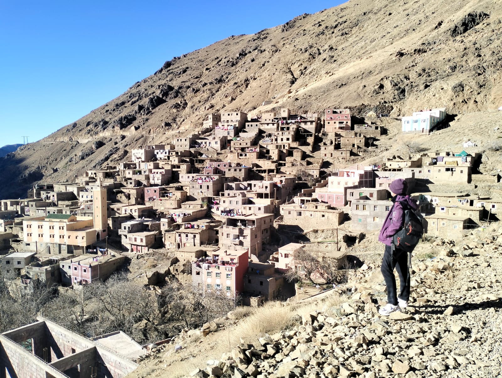 In loco abbiamo verificato che il toponimo corretto del villaggio che abbiamo sempre rappresentato in foto è Ikiss, individuabile peraltro con Google Maps, anche se la scritta compare in arabo (اٍكيس), a differenza di Tamegest, agglomerato di case adiacente quasi senza soluzione di continuità. Fortunatamente la comunità di Tamegest non ha problemi di approvvigionamento idrico, essendo fornita di un buon pozzo, ma non sufficiente a sopperire anche alle necessità di Ikiss. A differenza della visita che abbiamo effettuato a settembre - necessariamente limitata ai centri principali di Asni e Imlil, in quanto le strade dell’interno non erano ancora percorribili – questa volta abbiamo potuto renderci conto delle reali dimensioni della devastazione prodotta dal sisma. Un disastro evidenziato da case crollate, detriti e massi precipitati sulla carreggiata che sono stati rimossi ma causano ancora diversi restringimenti (foto qui sotto), frane sui fianchi delle montagne e, ovunque, unità abitative mobili (poche) e tende (molte) per ospitare le famiglie terremotate. Ovunque questa gente di montagna si è rimboccata le maniche e i villaggi sono altrettanti cantieri dove fervono i lavori di ricostruzione o di messa in sicurezza delle abitazioni, supportata economicamente, a quanto ci dicono, dal Governo Centrale.
