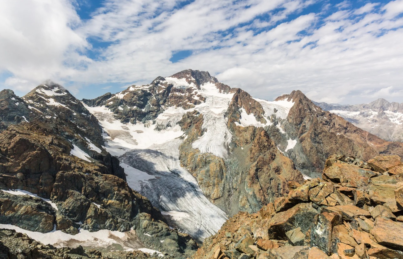 Si attraversa il Passo di Scerscen per poi raggiungere lo spettacolo del Ghiacciaio di Fellaria, con le sue pareti di ghiaccio che sprofondano direttamente nel lago, immagine potente della natura che cambia. Il tracciato si snoda tra vaste pietraie d'alta quota e pascoli silenziosi, offrendo lo spettacolo dei ghiacciai pensili che brillano all'orizzonte. Il paesaggio varia ad ogni tappa, i colori delle differenti rocce si fondono con il verde dei boschi e i diversi verdi dei pascoli.